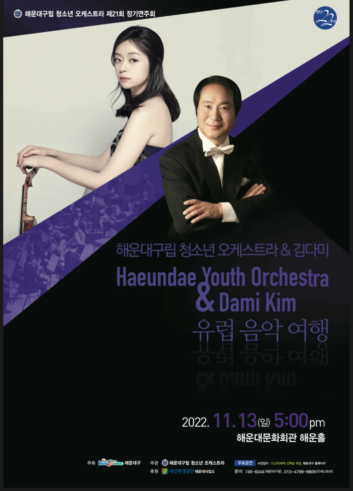 Nov 13 Haeundae Youth Orchestra & Dami Kim Sunday, November 13, 2022 5:00 PM 6:00 PM Google Calendar ICS 2022년 11월 13일(일) 오후 5:00 View Event →